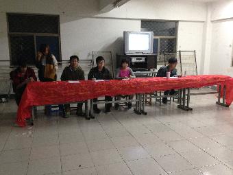 22日晚6點整,當筆者來到比賽場地時,已經有積極參與其中的選手早早來到現場了。報名靠後的同學或者在認真聆聽着表演選手歌唱,或者依舊在緊張地準備着。一位男同學正在展示才能,“手持”礦泉水瓶,忘我地演唱,評委也在安靜而又嚴肅地聆聽着。一曲完畢,場上響起了熱烈的掌聲,而剛才歌聲真摯優美的選手從歌曲中走出來後,顯然有些緊張,匆匆離開了。接下來的男同學演唱的是李行亮的《願得一心人》,這首心碎而又深情的歌曲被他演繹得很完美,評委們也在微微颔首。