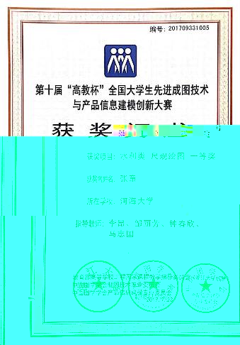 由教育部高等學校工程圖學教學指導委員會和中國工程圖學學會制圖技術專業委員會聯合舉辦的第十屆“高教杯”全國大學生先進成圖技術、産品信息建模創新大賽于2017年7月21日~24日在蘭州交通大學舉辦。我院2015級給排水科學與工程專業張童同學積極參與,經過選拔和培訓,在港航院老師的指導下,榮獲水利類尺規繪圖一等獎,水利類個人全能二等獎以及水利類團體一等獎的好成績。