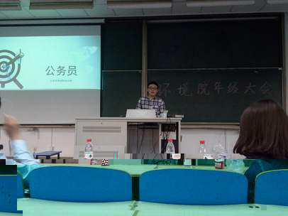 關于考研方面,餘靖學長和孔慶學長作經驗分享。兩位學長都介紹了考研内容、時間規劃并分享了自己的考研經曆與心得體會,也提及了考研過程中會遇到的一些難題比如決心不夠堅定、考研和專業課程學習的平衡等等。關于出國方面,劉韻學姐從準備工作、TOEFL/GRE學習方法、中介等方面分享了她的經驗。關于英語學習,學姐很細緻地總結了聽說讀寫四方面的學習技巧給大家做了分享。曹文卓學長最後作公務員考試經驗的分享。首先給大家分析了公務員崗位的優缺點,再分别介紹了公務員的招考方式、曆年來國考考錄情況、錄用流程、公務員考試的題型結構和考試備考心得。