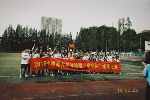 2018年5月28日下午兩點,在河海大學校本部操場舉辦了2018年河海大學環境院“畢業杯”拔河比賽,所有即将畢業的2014級環境院學子無論是參加比賽的還是在一旁加油助威的,都齊聚此刻,在烈日炎炎下進行準備工作。比賽采取三局兩勝的制度,先進行小組賽,A組為環工一班、環科一班、給排水一班;B組為給排水4班、環境一班、環境二班;C組為給排水二班、給排水三班、環工二班。三組組内循環,取第一名,然後各組第一進行循環賽,決出一二三名。