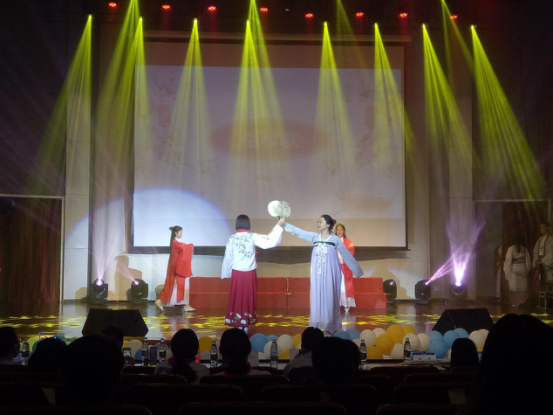 晚會的第二部分“熱血青春”正式拉開帷幕。首先由環境科學(中外合作)1班的同學們帶來《相和歌》。女孩兒們身着漢服,向我們款款走來。充滿古典元素的表演吸引了全場的眼球。這也印證了那句,“民族的,才是世界的!”