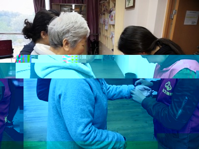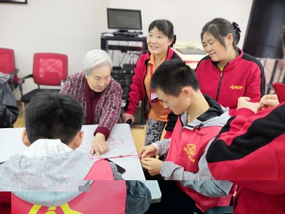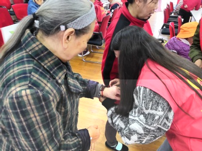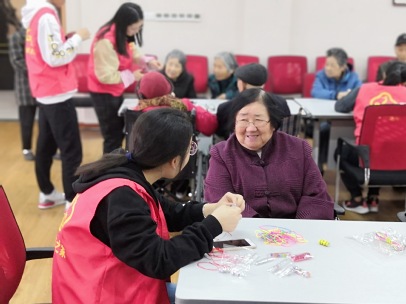 剛開始編手鍊時大家還有些生疏,但在與老人一起觀看視頻,共同分析步驟後,大家逐步把握了技巧。随着時間的推移,大家編織的手鍊也越來越好,編織的速度也越來越快。編好後,志願者們紛紛為老人佩戴上親手編織的手鍊。看到老人們開心的笑臉,大家都不禁感到此次活動十分有意義。
