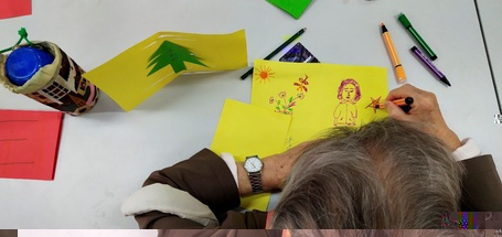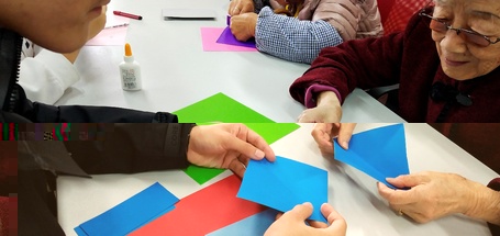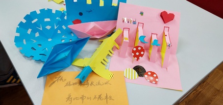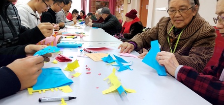 在負責人的帶領下,大家擺放好了座椅和手工道具。待老人入座後,志願者們也紛紛就座并開始和老人們一起制作手工賀卡。剛開始大家還有些生疏,但在觀看了相關教學視頻以及創意圖片後,大家的想法便如同雨後春筍一般冒出。一些志願者們還巧妙運用了剪紙的技巧,做出了别出心裁的賀卡。