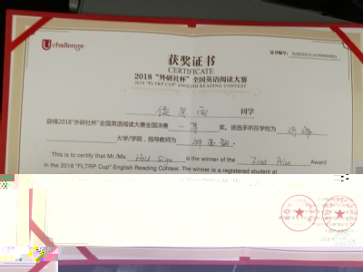2018年12月9日,我院2015級環境科學專業本科生侯思雨同學在全國英語閱讀大賽中喜獲一等獎。 此項大賽由外語教學與研究出版社,教育部高等學校大學外語教學指導委員會等組織聯合舉辦,曆時3個月,由網絡賽、學校落地賽、省内複賽和全國決賽組成。侯思雨同學于學校落地賽中脫穎而出,以校級特等獎晉級省賽,又力壓省内其他高校選手以江蘇省第一名的成績順利晉級全國決賽,最終在全國賽中取得一等獎的好成績。