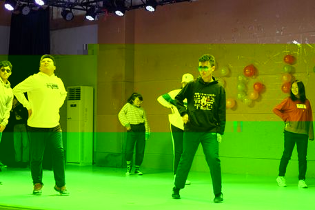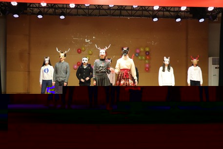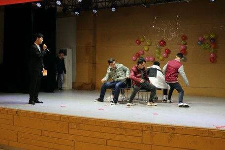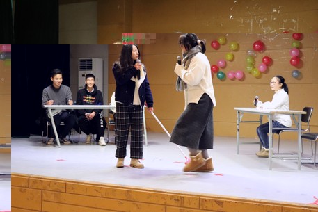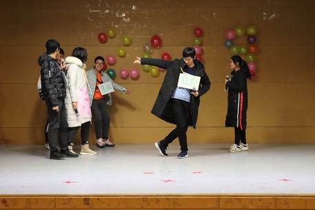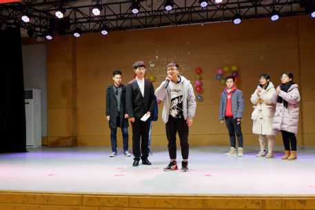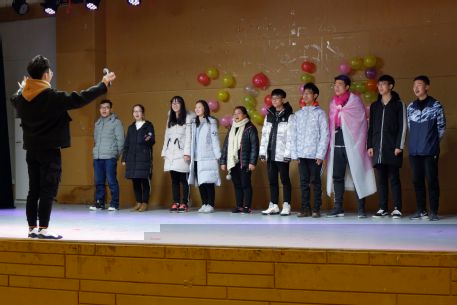 不知不覺欣賞了不少節目,現在又到了現場互動遊戲時刻,在場内氛圍的帶動下,踴躍加入的同學更多了,連場下看節目的輔導員鈕青也被同學們推上了場,加入到遊戲中。有了輔導員的參與同學們更加激動,現場氣氛再次到達高潮。