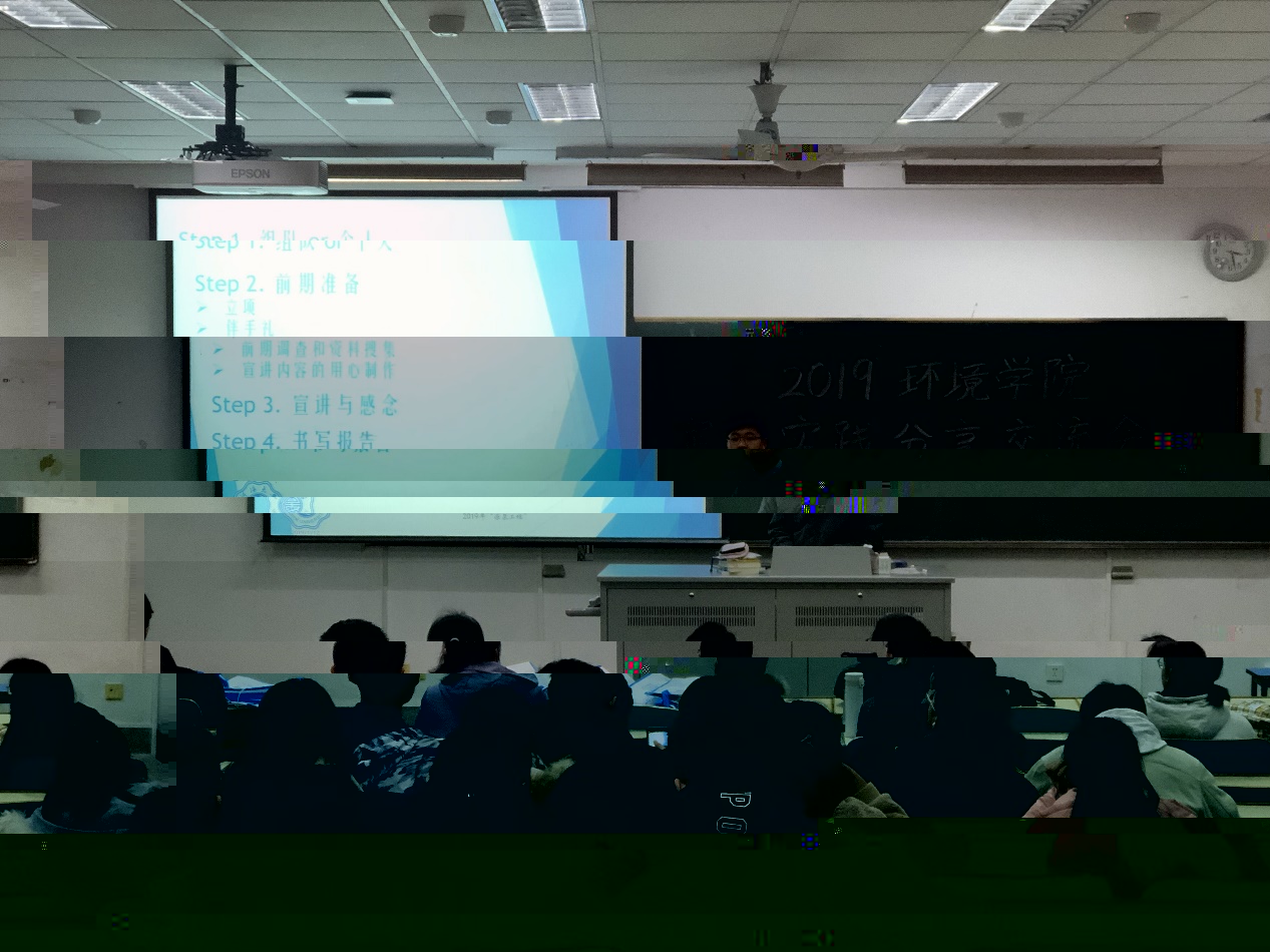 王少偉和汪涵同學則是參與了在環境院立項的團隊實踐。他們首先介紹了如何在回母校宣講前做好前期準備,以應對學弟學妹和家長們的各種問題。然後他們為我們分享了物資準備經驗,例如除學校提供的資料外還可以自己制作海報、書簽和明信片等小禮物。此外,他們還分享了去年答辯時的PPT,并展示了優秀的申請書和策劃書,讓18級同學了解了如何去評選優秀實踐團隊。