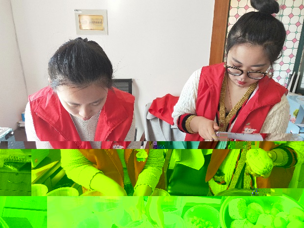 中午12點,志願者們在學校東門地鐵口集合,一起乘地鐵到達了金港花園小區裡的敬老院活動室。因為本次活動的主題是“美味蛋糕慶三八”,故而志願者們稍做休息便投入到了活動的準備工作中。男生幫忙搬桌椅、貼橫幅,女生幫忙鋪桌布,一切井然有序。當工作人員把活動所需材料拿來後,志願者們又開始清洗蛋糕用具、切分水果,為老人們的到來做好準備。