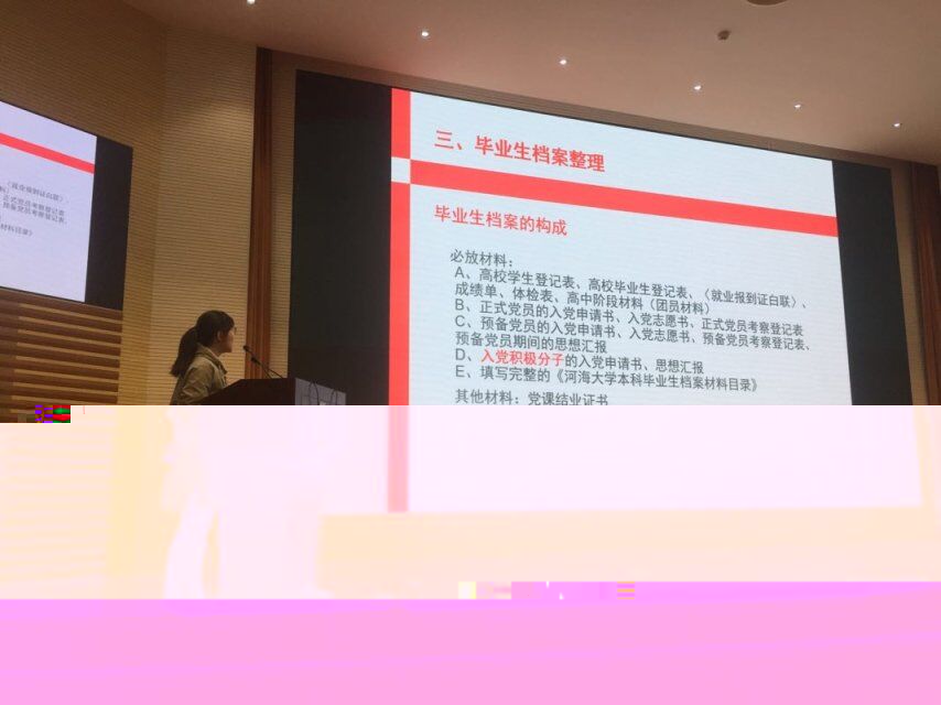 在大會上王劍老師主要從畢業生戶口遷移注意事項,畢業生登記表填寫要求,畢業生檔案整理和報送流程,就業計劃核對等幾個方面為大家進行講解總結,并以往年工作經驗提醒大家重要的時間節點,同時希望大家自己對自己負責,注意重要通知,認真填寫好每一份材料,确保能順利畢業。