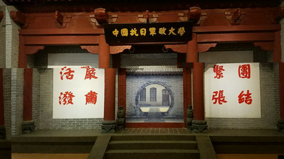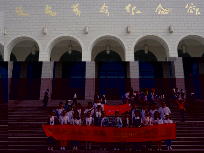 紀念館前的廣場,毛主席的銅像巍然伫立,他雙手撐腰,堅毅的目光凝視遠方,同學們看到主席的銅像肅然起敬,紛紛回想起那段艱苦的抗戰曆史。背後坐落的即是紀念館,館前入口上有郭沫若先生所題寫“延安革命紀念館”館名。