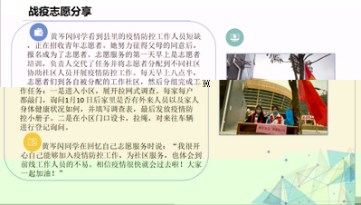 本次疫情,本支部的團員也積極投身抗疫工作中,團員黃岑閃和姚晨主動報名了當地社區和團委的抗疫志願活動,堅定地為防疫工作作出了自己的貢獻。于是本次團日活動本環節邀請她們開展線上宣講報告與故事分享環節。