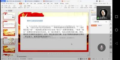 主持人邀請團員鐘念霜同學向團員們講述了武漢00後男孩潘峰在疫情期間的“硬核故事”。這位“全國優秀共青團員”是雷神山醫院最小的建設者,其父是雷神山醫院工程師,其母是抗擊疫情一線的醫護人員。疫情最嚴重的時候,這一家人都在前線逆流而行,确實令人尊重。