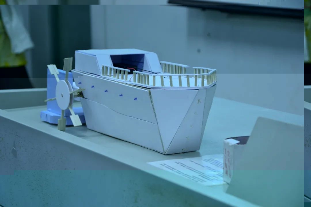 為了契合槳聲燈影的主題,選手們别出心裁的燈光設計讓人眼前一亮。LED燈的插入十分巧妙——獨具匠心的選手将小燈泡插入燈籠裡,營造出“江船火獨明”的詩意氛圍。水面上蕩漾開的光影交織在船體上,引人遐想。秉持着環保理念,選手們大多使用了PVC闆和木材類的環保材料進行制作,上色和粘合也使用的丙烯顔料與熱熔膠,最大程度減少了材料對環境的影響。同學們在保證船體穩定性的前提下,盡可能地使用生活中廢棄的木筷和快遞盒,使其綻放了第二次生命。