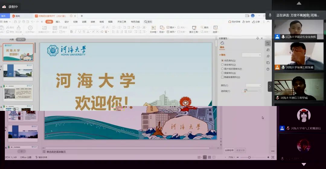 宣講會正式開始,小組成員在騰訊會議電腦端展開宣講會議,輪流向進入會議的北流高中學子從學校地位、特色專業、校園文化、生活環境、招生政策等各方面全方位地展示了河海大學豐富多彩的校園學習、課餘生活等,除此之外,考慮到高三同學的學習情況,團隊成員為正處于沖刺階段的學弟學妹們分享了自己在高三時的複習方法,解題策略,應考心态,時間規劃等,表達了對同學們金榜題名的美好祝願。