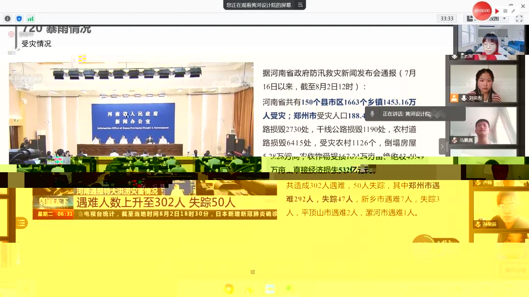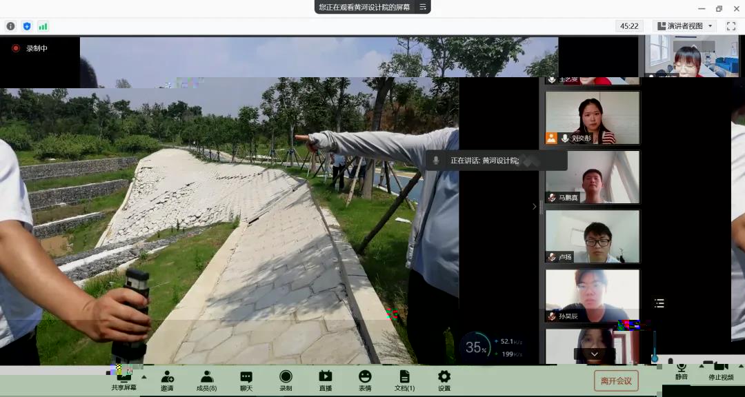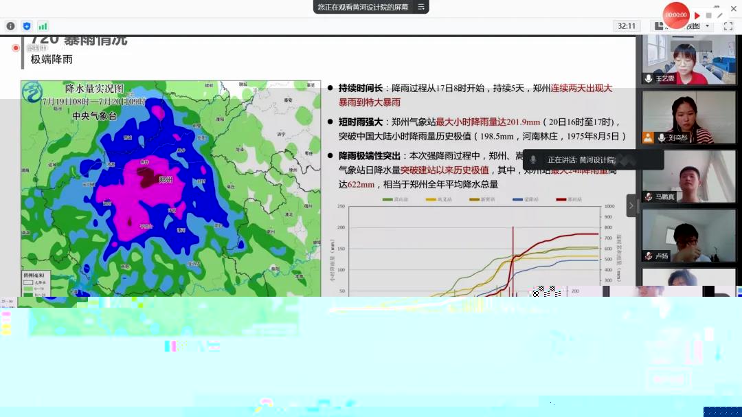 8月25日上午十點半,實踐團連線黃河設計院,并與黃河設計院生态院團委書記趙地,生産經營管理部副主任劉信勇,生産經營管理部黃倩影,生态環境所鮑珊珊、張超,景觀文化所曹平偉、張方方共同召開了騰訊會議。在會議上,實踐團成員了解到黃河設計院在此次暴雨洪災中積極應對,并在災後及時總結問題所在。同時,實踐團成員獲悉,鄭州地處淮河流域,本次鄭州暴雨洪災其實對黃河影響較小,并不會如群衆所擔心的,導緻黃河發生大洪水。相比之下,像賈魯河等淮河支流面臨的壓力更大。因此,做好群衆科普,避免群衆因謠言而導緻恐慌是非常有必要的。