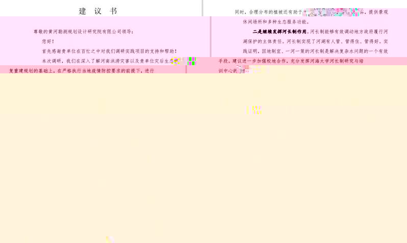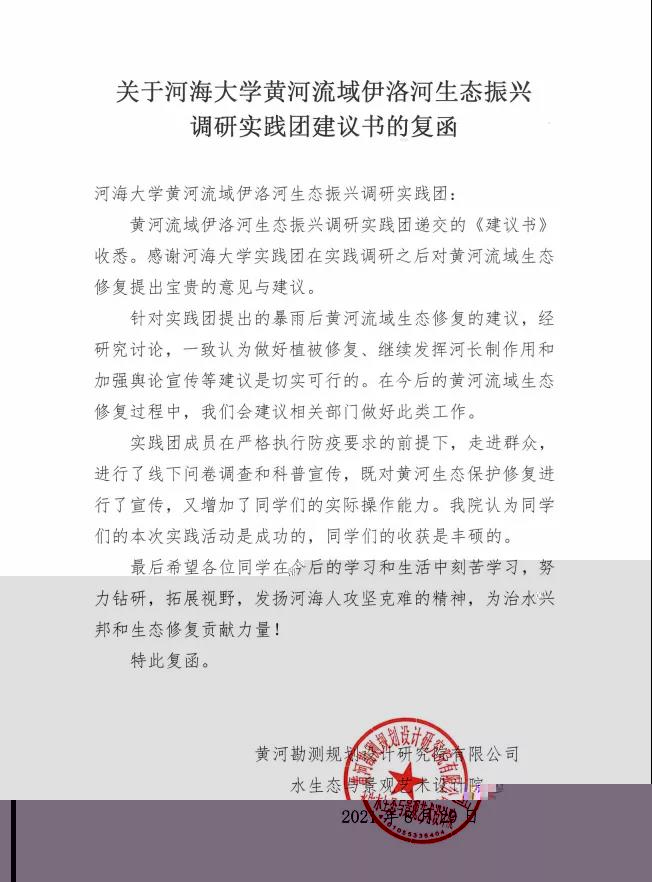 為期兩天的問卷發放與科普宣傳,實踐團共收集到線上、線下問卷共近400份。實踐團成員認真整理和彙總了問卷數據,并結合與群衆深入交流的内容,向黃河設計院提交了一份建議書,闡述了群衆對黃河流域生态修複重建的願景,并代群衆向一直以來為黃河流域生态建設不懈努力的黃河設計院工作人員表達了衷心的感謝。黃河設計院相關工作人員在收到建議書後給予回信,也對實踐團成員表達了真摯的謝意與殷切的期盼。