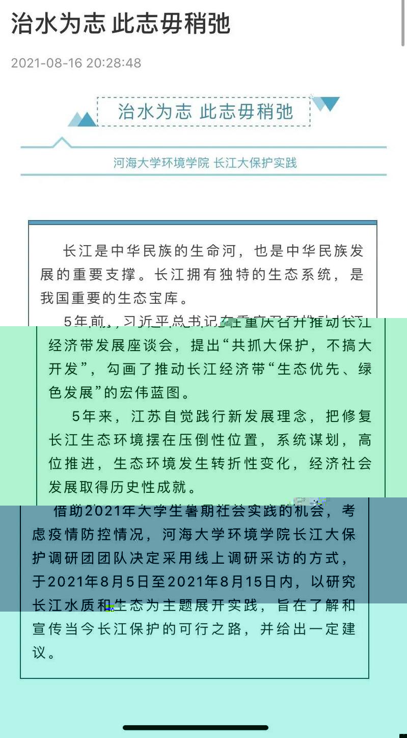 總結推文放送環節,團隊将之前三項成果的文字與圖片資料精煉整合,并對其通俗化處理後制成了一篇社會科普類的推文,以個人形式在線上進行推廣宣傳,盡我們之力讓更多人了解到有關長江大保護的知識,将精華成果真正與社會相連,從而實現社會實踐之于社會的價值。