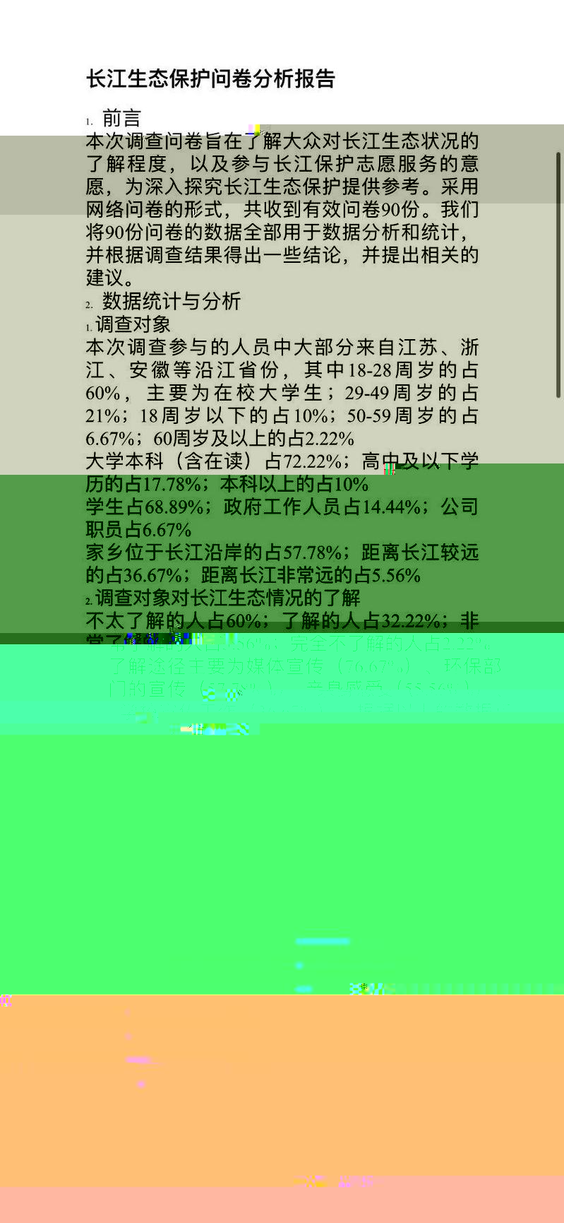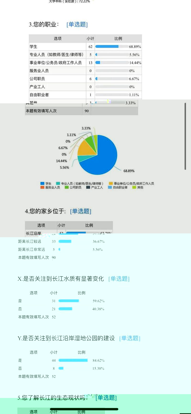 問卷調研分析環節,團隊精心制作了一份普及性強的問卷,通過線上方式廣泛發布,收集答卷信息。經過缜密的統計,團隊結合問卷結果精心制作了南京居民關于長江大保護的調研總結,運用柱狀統計和餅狀圖對得到的數據進行彙總,并對數據揭示的現象做了一份深度分析,從而總結得出長江保護目前的長處與不足,進而提出有針對性的建議,最大化的深挖了問卷的内核價值。