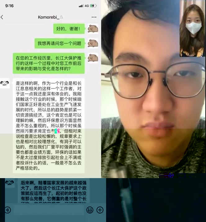 線上深度訪談環節,團隊通過線上方式連線了她,作為格靈化工公司的經理,她為我們詳細介紹了這項政策在這些年裡對她的生産工作産生的影響。這位一線從業人員認真仔細的回答了團隊提出的四個問題,深度剖析了長江大保護對前沿企業的廠建原則帶來的本質變化,提出了對未來更進一步的保護工作的展望,寶貴的經驗和體悟使我們受益匪淺。