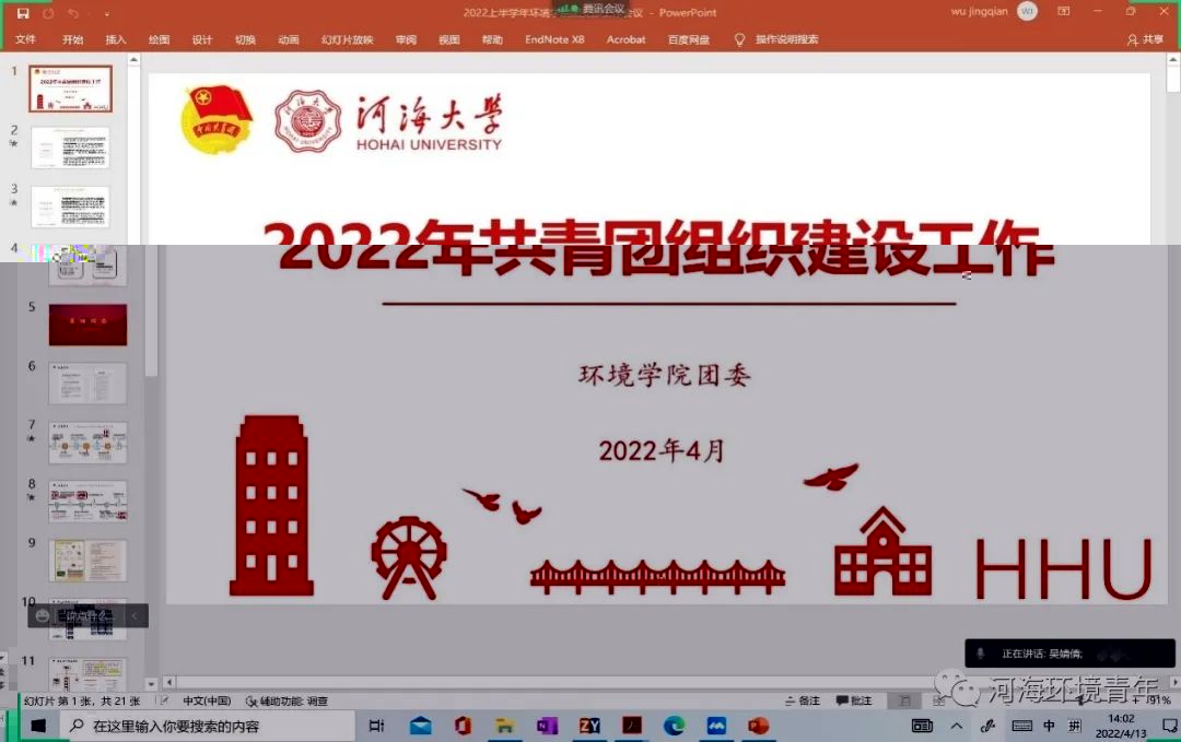 4月13日,伟德国际1946bv官网團委組織召開了2022年共青團組織建設工作線上會議。會議對2022年團支部工作進行指導部署,并對團支部工作提出要求、明确目标,确保本年度支部工作的有序推進。為嚴格落實疫情防控要求,本次會議以線上會議的方式舉行。會議由伟德国际1946bv官网團建指導員吳婧倩同學主持,學院全體學生團幹部參與本次會議。