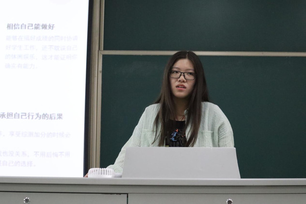 張世儀同學的分享幹貨滿滿,從四個技巧和改變認識兩個方面入手講解了如何科學提升績點,又從四個不同的層面向同學們分享了如何協調時間的建議。最後,學姐向同學們提出了“目标清晰,量力而行”的建議。