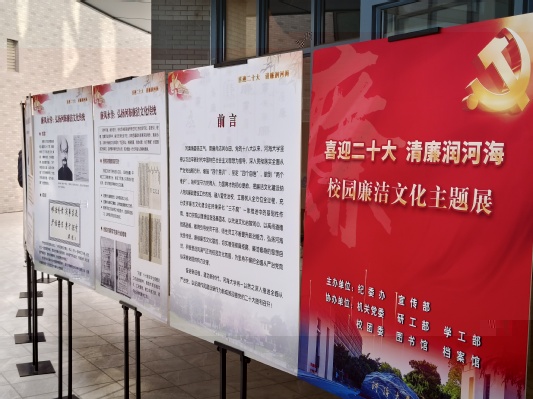 河清海晏揚正氣,崇廉尚潔潤心田。本次展覽以喜迎二十大與校園廉潔文化為主題,通過主題鮮明、内容豐富的圖片展,向同學們展示了河海大學的廉潔文化傳統,現今的廉潔教育建設和中國共産黨持續奮鬥的光輝曆程。