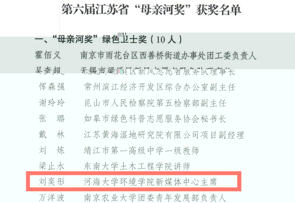 近日,共青團江蘇省委對第六屆江蘇省“母親河獎”獲獎者進行了表彰。我院2020級本科生劉奕彤同學榮獲第六屆江蘇省“母親河獎”綠色衛士獎。